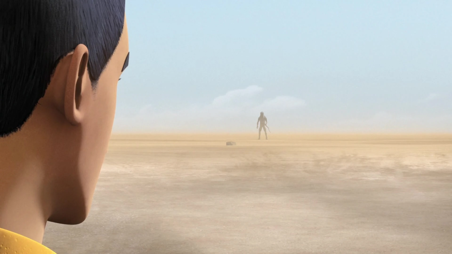 Seeking a way offworld, Ezra and Chopper, who had stowed away on Ezra's ship, debated whether to follow the natural ridge lines of the canyons in the hope of finding a nearby settlement or crossing the vast desert in front of them. Maul appeared as an apparition and convinced Ezra to travel into the desert. Ezra and Chopper traveled into the desert. Eventually, Chopper's battery died, and Ezra, overcome by heat and exhaustion, collapsed and lost consciousness. A short while later, Ezra and Chopper were discovered by Kenobi, who was riding a Dewback. Constructing a small campfire, Kenobi recharged Chopper with power from a portable light and tended to Ezra's wounds.