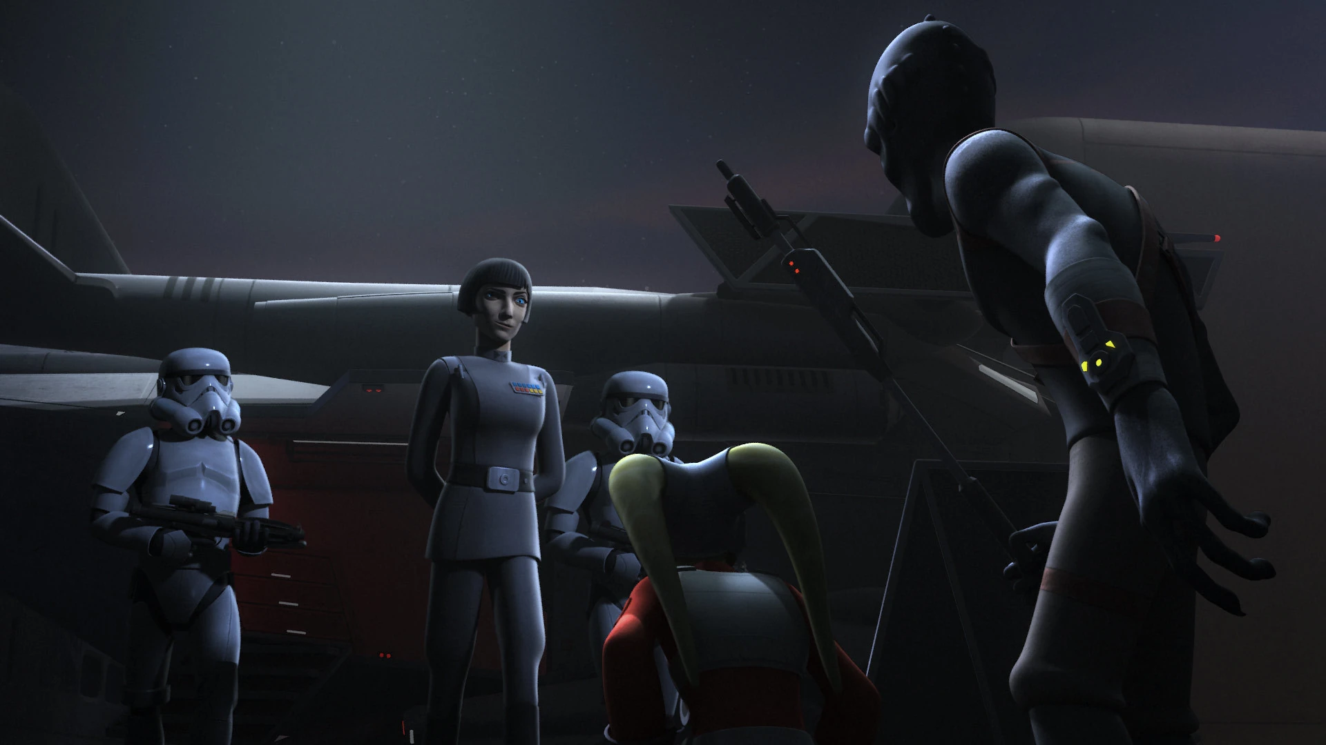 Rukh presenting the captive Hera Syndulla to Governor Arihnda Pryce.